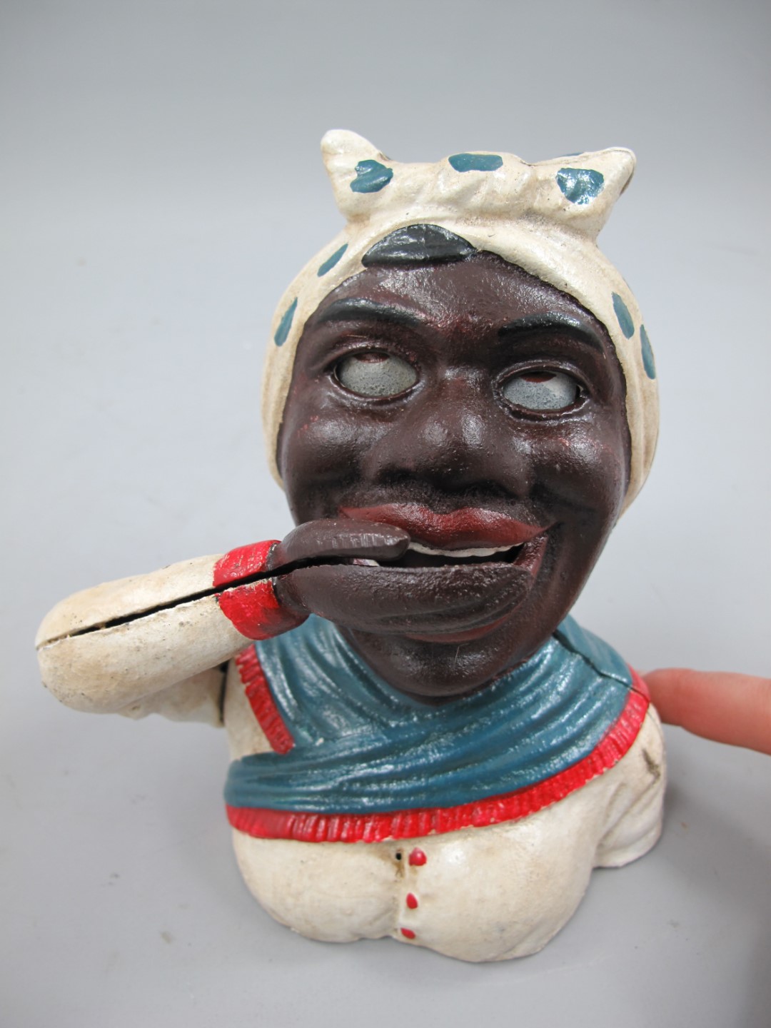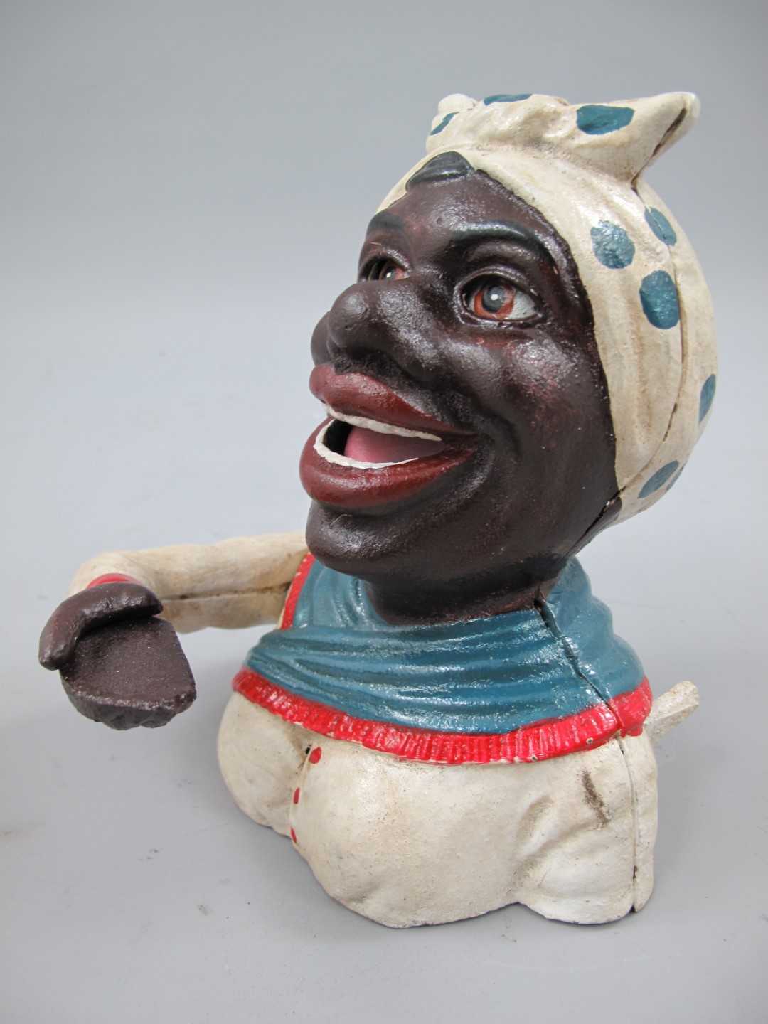 Spardose(Mechan.) FRAU Eisen weiss H.17x15cm